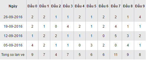 Quan sát bảng thống kê các cặp loto theo đầu số trên đây của XSPY trong 30 ngày gần nhất cho ta thấy, đầu 7 đang chiếm ưu thế mạnh nhất với 14 lần xuất hiện trên bảng kết quả, trong đó có 1 ngày thăng hoa nhất với 5 lần góp mặt (ngày 12/09/2016). Theo ngay sau là đầu 0 và 8 với mỗi đầu có 9 lần xuất hiện. Các đầu còn lại về đều đặn không có sự vượt trội nào, đầu 2 xếp chót khi chỉ sở hữu cho mình 4 lần về trong tháng qua. Hãy cùng hi vọng vào kết quả quay thưởng chiều nay sẽ làm thay đổi bảng tổng hợp loto theo đầu này.