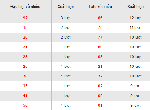 Quan sát bảng thống kê các cặp loto về nhiều của XSQNA trên đây ta thấy, bộ số 66 đang dẫn đầu bảng với 12 lần xuất hiện, ngày về gần đây nhất vào ngày 27/08/2016. Theo sau đó là bộ 79 sở hữu 11 lần về. Có 5 bộ số đều có 10 lần xuất hiện đó là 77, 60, 21, 32 và 05. Bộ ba 02, 09, và 61 khiêm tốn chỉ với 9 lần xuất hiện trên bảng và ngậm ngùi xếp chót cuối bảng.