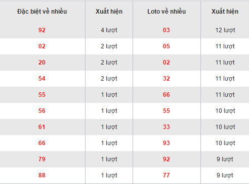 Quan sát bảng thống kê trên ta thấy, bộ số 03 đang dẫn đầu với 12 lần xuất hiện, ngày về gần đây nhất vào 11/4/2016. Tiếp theo đó là các bộ 05,02,32,66 đều sở hữu 11 lần về. Có 3 bộ số đều có 10 lần góp mặt đó là các bộ 55-33-93. Xếp chót bảng với 9 lần xuất hiện là 2 bộ số 92 và 77.