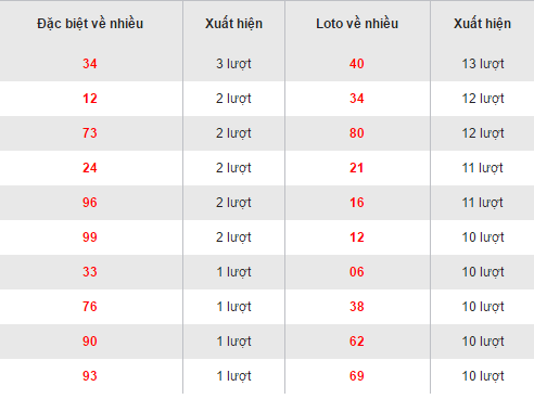 Quan sát bảng thống kê các cặp loto về nhiều của XSVT trên đây ta thấy, bộ số 40 đang dẫn đầu bảng xuất hiện với 13 lần xuất hiện. Bộ số 34 và 80 là hai bộ số tiếp theo với số lần xuất hiện 11 lần. Hai bộ số 21 và 16 thì đồng sở hữu 11 lần về. Các bộ số còn lại trong bảng cùng sở hữu 10 lần về đó là 12, 06, 38, 62, 69.