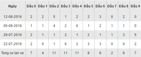 Theo kết quả thống kê đầu số XSVL trong 30 ngày gần nhất thì ta thấy các đầu 2,3 và 4 đều nổi bật với 11 lần về, trong đó đầu 3 và 4 có ngày thăng hoa nhất về tới 6 lần (đầu 3 ngày 22/07 và đầu 4 ngày 05/08). Rất đáng tiếc cho đầu 7 phải xếp chót khi chỉ sở hữu 2 lần về trong tháng. Đầu 9 chỉ có tổng cộng 7 lần về trong tháng tuy nhiên lại có một ngày thăng hoa với 5 lần về(ngày 29/07).