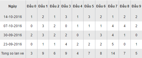 Quan sát bảng thống kê các cặp loto về theo đầu số trên đây của XSNT trong 30 ngày gần nhất ta thấy, đầu 7 đang chiếm ưu thế lớn nhất với 14 lần xuất hiện trên bảng kết quả, trong đó có 1 ngày thăng hoa nhất về với 5 lần (ngày 23/09/2016). Theo sau đó là đầu 1 và 3 với 9 lần xuất hiện trên bảng kết quả trong 30 ngày trở lại đây, lần về thăng hoa nhất của đầu 3 là 4 lần trong ngày 23/09/2016. Đầu 6 sở hữu 8 lần về, kèm sau là đầu 5 và 8 với 7 lần xuất hiện. Đầu 0 kém may mắn đành ngậm ngùi xếp chót khi chỉ chiếm chân trong 3 bộ số trong vòng 1 tháng qua.