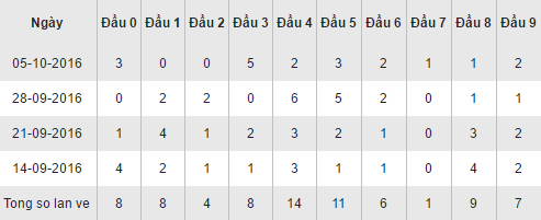 Quan sát bảng thống kê các cặp loto theo đầu số trên đây của XSST trong 30 ngày gần nhất ta thấy, đầu 4 đang chiếm ưu thế nổi bật với 14 lần xuất hiện trên bảng kết quả, trong đó có 1 ngày thăng hoa về với 6 lần góp mặt (ngày 28/09/2016). Theo ngay sau là đầu 5 với 11 lần xuất hiện. Các đầu còn lại về đều đặn và không có sự vượt trội nào, duy chỉ có đầu 7 đen đủi khi xếp chót chỉ với duy nhất 1 lần về trong vòng một tháng.
