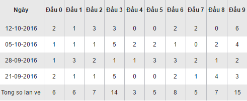 Bảng thống kê các cặp loto theo đầu số trên đây của XSCT trong 30 ngày gần nhất cho ta thấy, đầu 9 thật xuất sắc khi đang chiếm được ưu thế lớn nhất với 15 lần xuất về, trong đó có 1 ngày thăng hoa về với 6 lần (ngày 12/10/2016). Đầu 3 thật đáng tiếc để vuột mất ngôi đầu bảng để về nhì với số lần xuất hiện là 14 lần. Các đầu số còn lại về ít và đều đặn hơn tuy nhiên không có sự nổi bật nào cả. Đầu 4 lần này lại ngậm ngùi xếp chót với chỉ 3 lần về trong vòng một tháng.