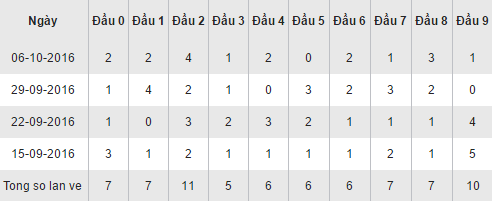 Quan sát bảng thống kê các cặp loto theo đầu số trên đây của XSQB trong 30 ngày gần nhất ta thấy, đầu 2 đang giữ ưu thế lớn nhất với 11 lần xuất hiện trên bảng kết quả, trong đó có 1 ngày thăng hoa về với 4 lần (ngày 6/10/2016). Bám đuổi sát nút là đầu 9 với 10 lần xuất hiện. Các đầu còn lại về đều đặn, không có sự vượt bậc nào cả, duy chỉ có đầu 3 ngậm ngùi xếp chót với chỉ 5 lần về trong vòng một tháng.