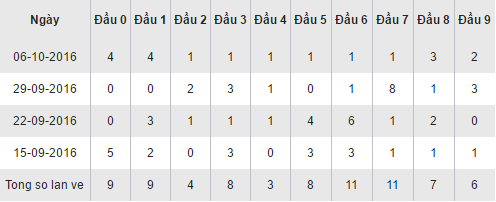 Bảng thống kê các cặp loto theo đầu số trên đây của XSTN trong 30 ngày gần nhất cho ta thấy, đầu 6 và 7 đang chiếm được ưu thế lớn với 11 lần xuất hiện trên bảng kết quả, trong đó đầu 7 có 1 ngày thăng hoa về với 8 lần (ngày 29/09/2016) và đầu 6 cũng có ngày về đến 6 lần (ngày 22/09/2016). Theo ngay sau là đầu 0 và 1 với mỗi đầu 9 lần xuất hiện. Các đầu còn lại về không có sự nổi trội nào cả. Đầu 4 ngậm ngùi đành xếp chót với chỉ 3 lần về trong vòng một tháng qua.