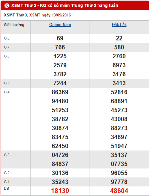 Như thường lệ, trước giờ quay thưởng của XSMT hôm nay, Xs24h mời quý vị và các bạn cùng điểm lại tình hình kết quả Xổ số miền Trung Quảng Nam, Đăk Lăk ở lần quay trước ngày 13/09/2016 nhé!