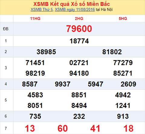 Những con số nào sẽ may mắn vinh danh trên bảng kết quả lần này, hãy cùng chúng tôi chờ đợi kết quả vào cuối ngày nhé. Còn bây giờ, Xs24h sẽ cùng các bạn đi vào bài bài tổng hợp, phân tích kết quả xổ số miền Bắc hôm nay ngày 12/08/2016. Trước tiên, cùng điểm lại tình hình kết quả XSMB hôm qua ngày 11/08/2016 nhé !