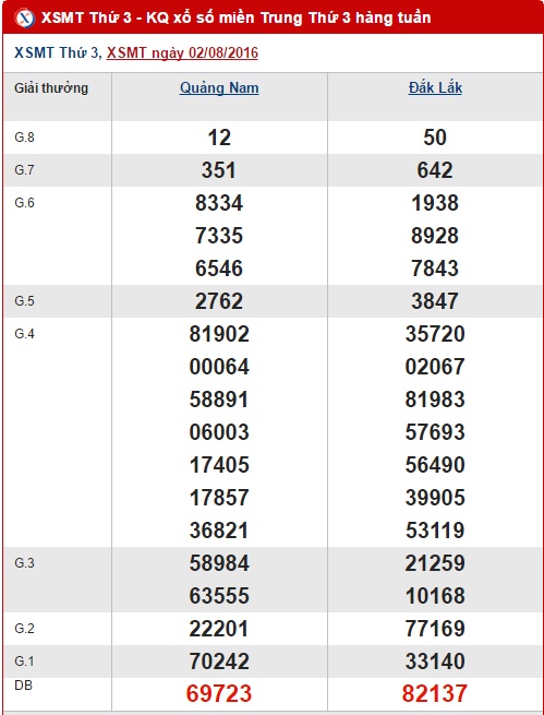 XSMT Thứ 3 - Đến hẹn lại lên, hôm nay XSMT mở thưởng trở lại với các tỉnh Đắk Lắk và Quảng Nam, mời quý vị và các bạn theo dõi kết quả vào cuối ngày nhé ! Như thường lệ, sau đây chúng tôi xin gửi đến các bạn nội dung bài tổng hợp, phân tích kết quả Xo so mien Trung hôm nay ngày 09/08/2016.
