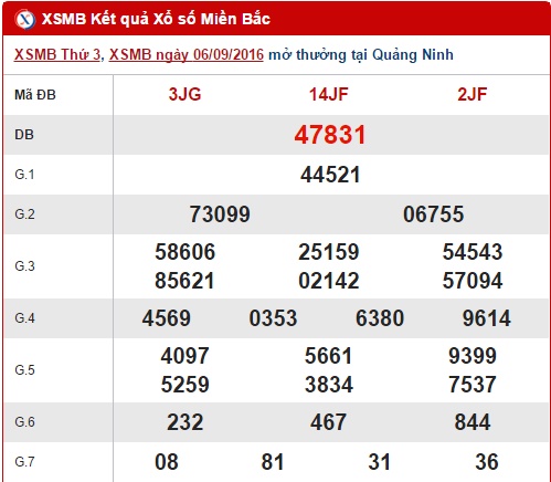 Như thường lệ, hôm nay thứ 4 ngày 07/09/2016, XSMB sẽ mở thưởng tại tỉnh Bắc Ninh vào chiều nay. Trước khi đến với kết quả quay thưởng vào chiều nay, Xổ số 24h xin gửi đến bạn đọc nội dung bài tổng hợp, phân tích kết quả XS miền Bắc trước giờ quay thưởng hôm nay. Trước tiên, hãy cùng chúng tôi review lại kết quả hôm qua ngày 06/07/2016 nhé !