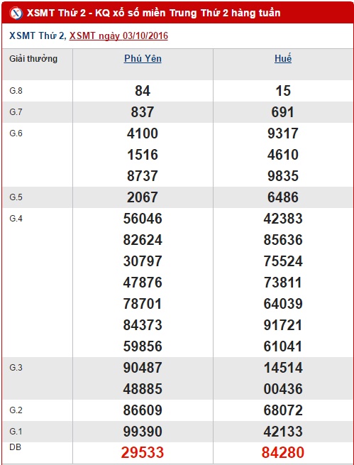 Trước khi đến với kết quả chiều nay của xổ số miền Trung, sau đây mời quý vị và các bạn cùng Xs24h đóng góp vào bài phân tích, thống kê kết quả XSMT các tỉnh Phú Yên, Huế hôm nay nhé! Mở đầu, hãy cùng điểm lại tình hình kết quả ở lần quay trước ngày 03/10/2016.