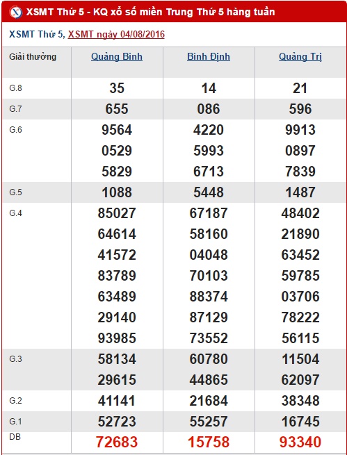 Lượt quay thưởng hôm nay của XSMT sẽ quay trở lại với các tỉnh Bình Định, Quảng Bình và Quảng Trị. Và trước khi đến với kết quả quay số chiều hôm nay, hãy cùng Xổ số 24h điểm qua những nét chính của tình hình Xổ số miền Trung tại các tỉnh Bình Định, Quảng Bình, Quảng Trị ở lần quay trước ngày 04/08/2016 nhé!