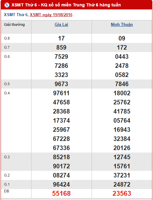 Như thường lệ, hôm nay những vòng quay của XSMT sẽ đến với các tỉnh Gia Lai và Ninh Thuận. Sau đây, Xổ số 24h mời quý vị và các bạn cùng điểm lại tình hình kết quả xổ số Miền Trung ở lần quay trước ngày 19/8/2016 nhé !