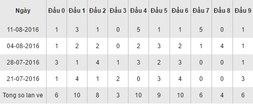 Quan sát bảng thống kê các kết quả XSBDI quay trong 30 ngày gần nhất ta thấy, đầu 1,4 và 6 đều đang giữ ưu thế với 10 lần về, trong đó đầu 4 có một lần quay thăng hoa với số lần về khá cao (ngày 11/08 - 5 lần). Vị trí á quân trong bảng thuộc về đầu 5 với tổng cộng 9 lần về. Đầu 3 ngậm ngùi xếp hạng chót với tổng cộng chỉ 3 lần về (ngày 21/07 - 2 lần và ngày 28/07 - 1 lần). Các đầu còn lại đều về khá đều đặn.