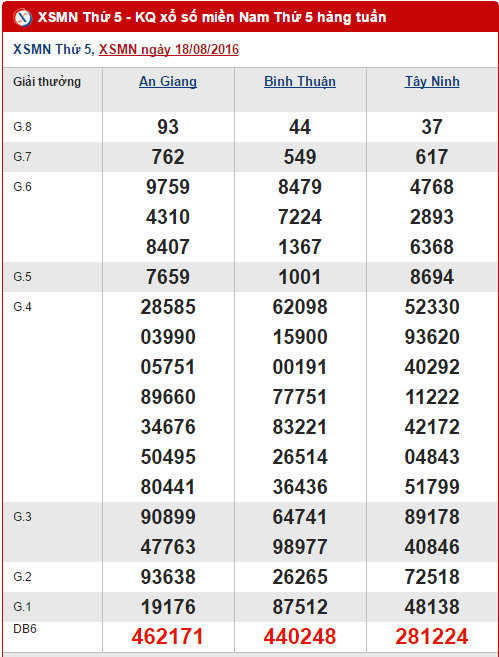 Sau đây, như thường lệ Xs24h mời quý vị và các bạn cùng điểm lại những nét chính trong bảng kết quả của XSMN ở lần quay trước ngày 18/08/2016 nhé!