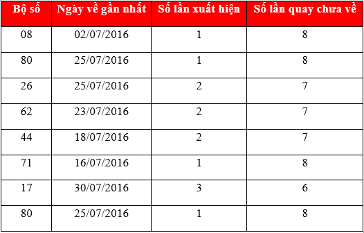 Khi thống kê KQXS XSHCM theo tổng 8 trong vòng 1 tháng kể từ ngày 01/07/2016 đến 01/08/2016 ta có được bảng thống kê sau: