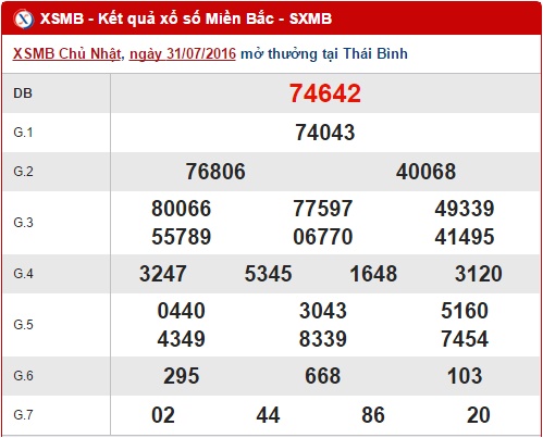 Như thường lệ, hôm nay thứ 2 ngày 01/08/2016 XSMB sẽ mở thưởng tại thủ đô Hà Nội, hãy cùng chờ đón những bất ngờ và may mắn đầu tuần vào cuối ngày nhé. Và trước khi chọn lựa cho mình những con số may mắn, hãy cùng nhau điểm lại tình hình XSMB ngày hôm qua 31/07/2016 nhé !