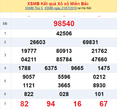 Trước khi đi vào phân tích kết quả XSMB hôm nay thứ 6 ngày 22/07/2016, hãy cùng chúng tôi review lại kết quả XSMB thứ 5 ngày 21/07/2016.