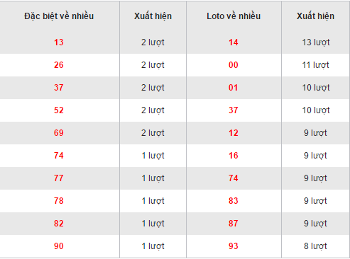 Các cặp số giải đặc biệt dẫn đầu bảng xuất hiện là cặp 13, 26, 37, 52 đều có 2 lần về góp mặt. Các cặp còn lại thì đều về đều đặn và khiêm tốn chỉ với 1 lần về duy nhất tại vị trí giải đặc biệt.