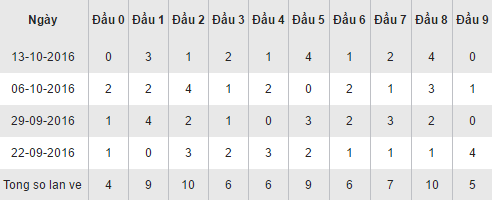 Đồng sở hữu 6 lần về trong tháng là các đầu 3, 4, 6. Kém may mắn hơn là đầu 9 chỉ về góp mặt 5 lần. Đầu 4 còn lại xếp chót khi chỉ có 4 lần xuất hiện trong tháng qua.