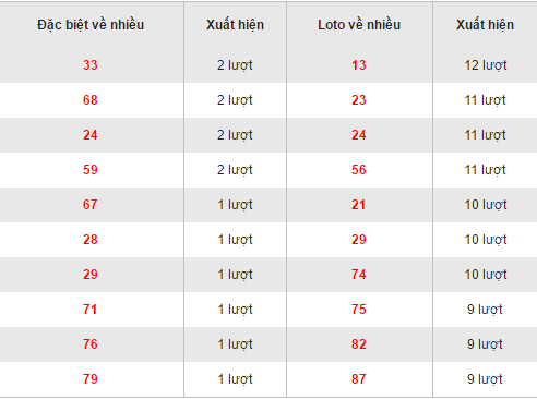 Quan sát bảng thống kê các cặp loto về nhiều trên đây của XSCT ta thấy, bộ số 13 đang dẫn đầu bảng với 12 lần xuất hiện, ngày về gần đây nhất vào ngày 27/08/2016. Tiếp theo đó là các bộ 23, 24, và 56 đều cùng sở hữu 11 lần về. Có 3 bộ số đều có 10 lần xuất hiện đó là 21, 29 và 74. Xếp chót cuối bảng là các bộ 75, 82 và 87 cùng với 9 lần xuất hiện trong 30 ngày gần đây nhất.