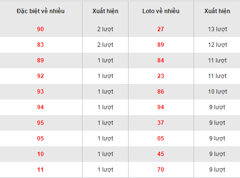 Quan sát bảng thống kê các cặp loto về nhiều của XSQB trên đây ta thấy, bộ số 27 đang dẫn đầu bảng với 13 lần xuất hiện, ngày về gần đây nhất vào ngày 27/08/2016. Hai bộ số tiếp theo cùng sở hữu 11 lần về đó là 84, 23. Cặp 86 là cặp duy nhất có được 10 lần về trong 30 ngày gần nhất. Các bộ số còn lại đều có 9 lần xuất hiện đó là 94, 37, 05, 45 và 70.