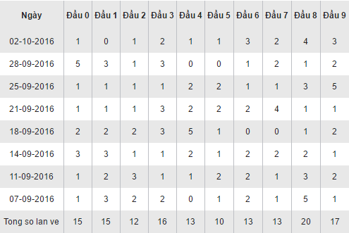 Quan sát bảng thống kê các cặp loto theo đầu số trên đây của XSKH trong 30 ngày gần nhất cho ta thấy, đầu 8 đang chiếm ưu thế mạnh nhất với 20 lần xuất hiện trên bảng kết quả, trong đó có 1 ngày thăng hoa nhất với 5 lần góp mặt (ngày 07/09/2016). Theo ngay sau là đầu 9 với 17 lần xuất hiện. Các đầu còn lại về đều đặn và không có sự vượt trội nào, đầu 5 xếp chót khi chỉ sở hữu cho mình 10 lần về trong tháng qua.
