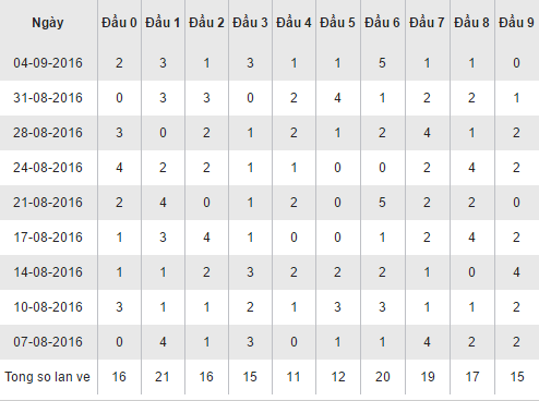 Quan sát bảng kết quả thống kê theo đầu số XSKH trong 30 ngày gần nhất trên đây ta thấy, đầu 1 nổi bật nhất với 21 lần xuất hiện trên bảng kết quả, trong đó có 2 ngày thăng hoa nhất về tới 4 lần (ngày 07/08 và 21/08). Theo ngay sau là đầu 6 chỉ kém hơn có 1 lần xuất hiện nhưng có 2 ngày thăng hoa nhất về đến 5 lần (21/08 và 04/09). Các đầu còn lại số lần về khá đồng đều nhau, chỉ đáng tiếc cho đầu 4 phải xếp chót khi chỉ sở hữu cho mình 11 lần về trong tháng.