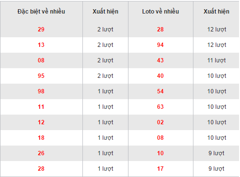 Đầu tiên là bộ số 28 và 94 cùng lúc sở hữu vị trí đầu bảng tần suất xuất hiện với 13 lần về, ngày về gần nhất lần lượt là. Tiếp đến, bộ 43 là bộ duy nhất sở hữu cho mình 11 lần về, vinh dự xếp vị trí á bảng với lần về gần nhất là ngày . Ở lần thống kê này, có đến 5 bộ số đồng loạt sở hữu 10 lần về tròn trịa đó là 40, 54, 63, 02, và 08. Cùng khiêm tốn xếp chót bảng đó chính là 2 bộ số 10 và 17. Thật là đáng tiếc phải không ạ ?