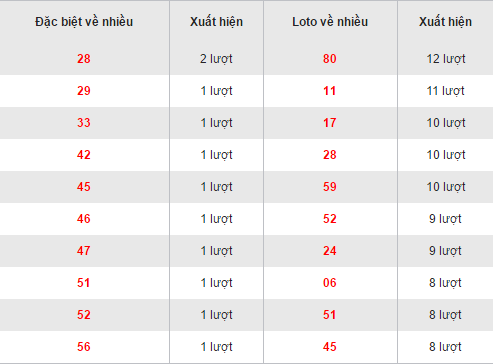- Lần thống kê này, có 3 cặp đều sở hữu số lần về là 10 lần đó là các cặp: 17, 28, 59.