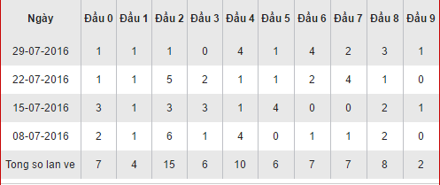 Khảo sát kết quả trong 10 lần quay gần nhất ta thấy, đầu 2 đang chiếm ưu thế nhất với 15 lần góp mặt, trong đó có 2 lần quay đầu 2 thăng hoa với số lần về khá cao (ngày 08/07 - 6 lần, ngày 22/07 - 5 lần). Các đầu còn lại về khá đồng đều nhau. Vị trí á quân trong bảng thuộc về đầu 4 với tổng cộng 10 lần về. Đầu 9 khá buồn khi xếp hạng chót với chỉ 2 lần về trong ngày 15/07 và 29/07. Đáng chú có đầu 1 trong 4 đợt mở thưởng gần đây nhất đều chỉ xuất hiện mỗi lần quay 1 lần.
