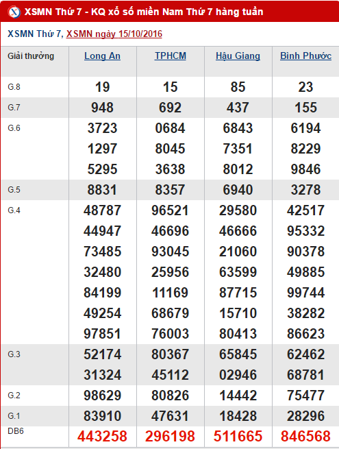 Cùng điểm lại những con số may mắn của XSMN tại các tỉnh Long An, Bình Phước, Hậu Giang và TP.HCM ở lần quay trước ngày 15/10/2016 nhé !