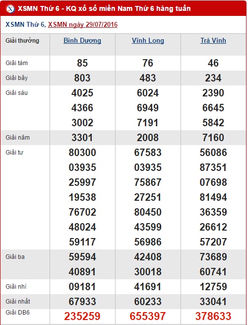 Đến hẹn lại lên, thứ 6 hàng tuần lượt quay thưởng của XSMN lại quay lại với người chơi ở các tỉnh Bình Dương, Vĩnh Long và Trà Vinh. Và như thường lệ, sau đây Xổ số 24h xin gửi đến các bạn bài tổng hợp, thống kê kết quả XSMN lần quay trước nhé !