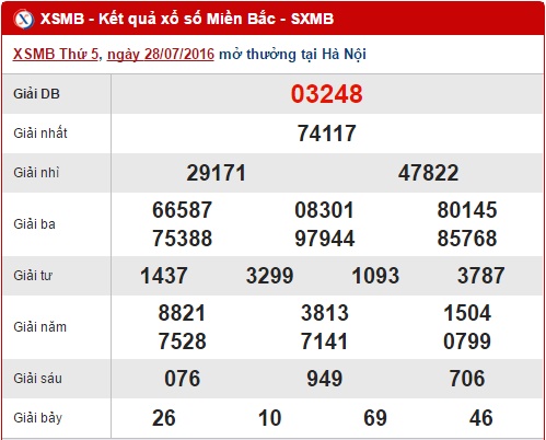 Như thường lệ, hôm nay Xo so mien Bac sẽ mở thưởng tại Hải Phòng và quay thưởng lúc 18h15 chiều nay. Trong khi chờ đợi kết quả, chúng ta sẽ tổng hợp và phân tích số liệu các kết quả ở lần quay trước nhé. Trước tiên hãy cùng Xs24h review lại kết quả XSMB thứ 5 ngày 28/07/2016.