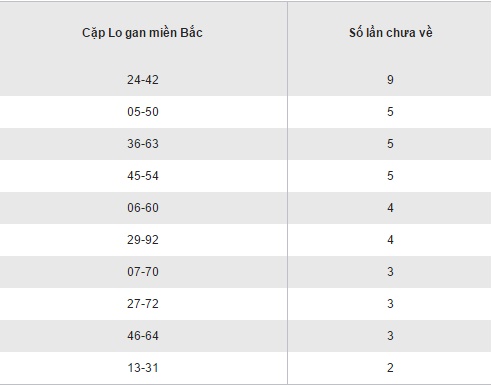 Sau đây là bảng thống kê loto gan XSMB hôm nay ngày 12/10/2016 được Xổ số 24h xây dựng với mục đích thống kê chính xác những cặp đôi lâu về nhất tính đến thời điểm hiện tại. Các cặp số được thống kê dựa trên những số lần về ít hơn của các cặp loto từ 00-99. Trước khi các bạn quyết định đầu tư cho một cặp số nào đó, hãy tham khảo, cân nhắc kỹ càng để có những quyết định sáng suốt nhất nhé !