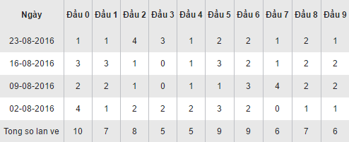 Đầu 0 dẫn đầu bảng với 10 lần về, tiếp sau đó là đầu 5 và đầu 6 đều có 9 lần xuất hiện. Đầu 3,4 xếp chót khi chỉ với 5 lần góp mặt, trong đó đầu 3 cũng vắng mặt tới 2 lần. Các đầu số còn lại duy trì được đều đặn số lần về qua các lần quay, duy chỉ có đầu 7 vắng mặt 1 lần ngày 02/08/2016.