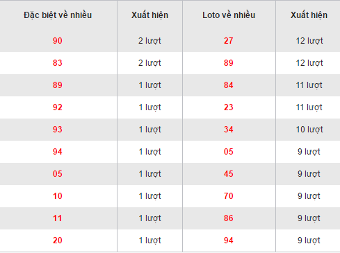 Quan sát bảng thống kê các cặp loto về nhiều trên đây ta thấy, bộ số 27 và 89 đang dẫn trước với 12 lần xuất hiện, ngày về gần đây nhất vào 04/08/2016. Tiếp theo đó là các bộ 84,23 đều sở hữu 11 lần về. Bộ 34 là bộ số duy nhất có 10 lần xuất hiện trong 30 ngày gần đây nhất. Các cặp còn lại 05, 45, 70, 86, 94 cùng sở hữu số lần xuất hiện là 9 lần.