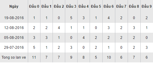 Theo quan sát bảng thống kê trên ta thấy, đầu 0 đang tạm dẫn đầu với 11 lần về, lần về nhiều nhất là 5 lần. Tiếp sau đó là đầu 6 về với 10 lần và may mắn chưa có lần vắng mặt nào. Đầu 3 cũng bám đuổi gắt gao với 9 lần về trong đó lần về nhiều nhất là 5 lần. Đầu 5 khá lép vế khi xếp chót bảng và chỉ có 5 lần về. Các đầu còn lại đều xuất hiện khá đồng đều nhau.