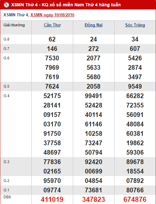 Lượt quay của XSMN hôm nay sẽ đồng loạt diễn ra tại các tỉnh Cần Thơ, Đồng Nai và Sóc Trăng lúc 16h20 chiều nay. Và trước khi đến với kết quả Xo so miền Nam hôm nay, hãy cùng Xs24h điểm qua tình hình kết quả của các tỉnh miền Nam ở lần quay trước ngày 10/08/2016.